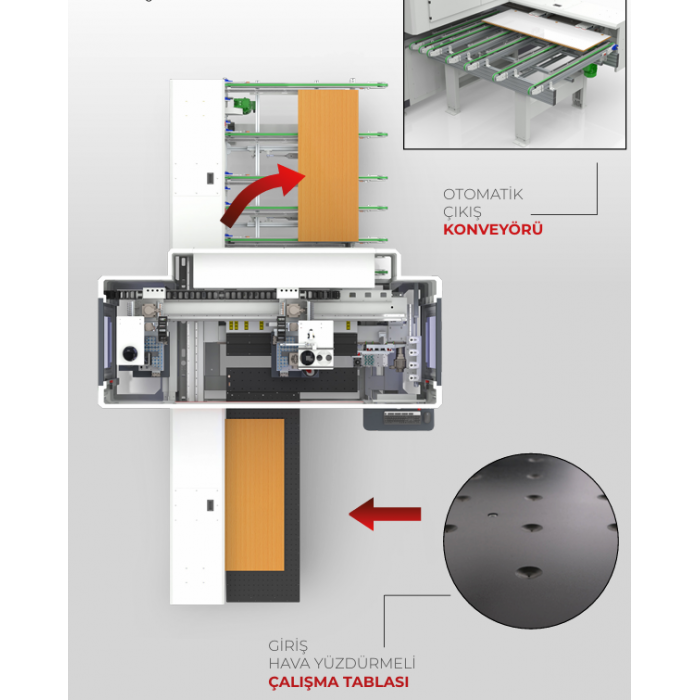 Hava yüzdürmeli giriş tablası, otomatik çıkış konveyörü ile