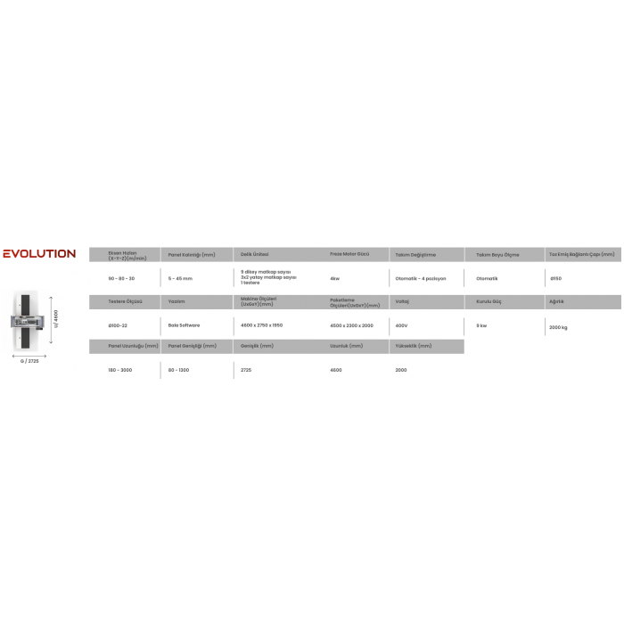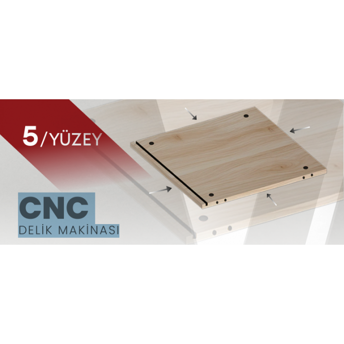 Felix Evolution CNC Delik Makinası, 5 yüzey işleme için özel olarak tasarlanmış bir delik ünitesi ile donatılmıştır. Bu ünite, 9 dikey delik matkap ucuna, 3x2 düzeninde 6 yatay matkap ucuna ve 1 testere içererek toplamda 16 delik matkap ucuna sunmaktadır. Ayrıca, üst delik ünitesi 4 kW’lık bir spindle ile güçlendirilmiştir; bu da verimli delik delme, frezeleme ve kanal açma işlemleri sağlar.
